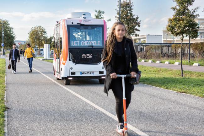 The service at Oncopole has been running between the main entrance and the remote parking lot, on a 600m mixed-traffic route, shared with bicycles, pedestrians as well as cars and buses since March. It will transition to fully driverless in the coming months.