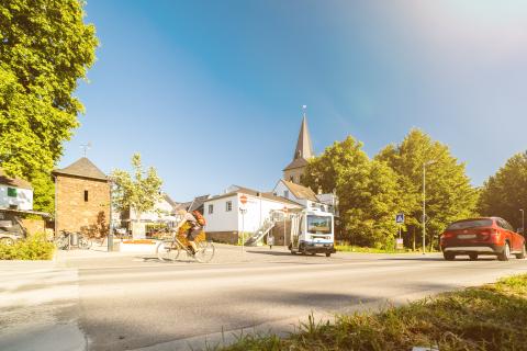 Line “A 01” starts at the Monheim bus station. Via Baumberger Straße it reaches Kirchstraße and continues to the “Evangelische Kirche” stop. Here it turns into the old town, passes Monheim’s landmark, the “Schelmenturm”, and finally reaches the stop “Altstadt” on the banks of the Rhine in a loop ride. From there it continues through the old town and via Kirch- und Baumberger Straße back to the bus station.